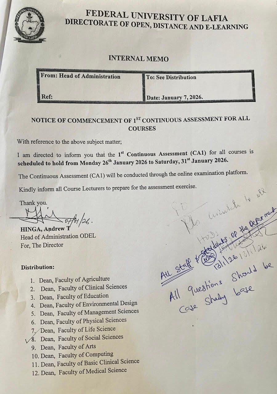 According to an internal memo released by the Federal University of Lafia, Directorate of Open, Distance and E-Learning (ODEL), the 1st Continuous Assessment (CA1) for all courses will be conducted online.